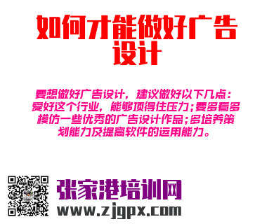 要想做好广告设计,建议做好以下几点:爱好这个行业,能够顶得住压力;要多看多模仿一些优秀的广告设计作品;多培养策划能力及提高软件的运用能力。