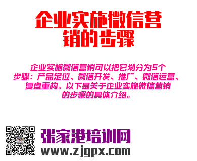 企业实施微信营销可以把它划分为5个步骤:产品定位、微信开发、推广、微信运营、复盘重构。以下是关于企业实施微信营销的步骤的具体介绍。