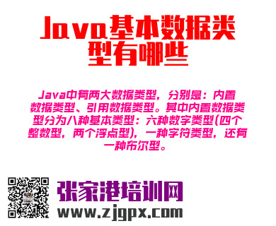 Java中有两大数据类型,分别是:内置数据类型、引用数据类型。其中内置数据类型分为八种基本类型:六种数字类型(四个整数型,两个浮点型),一种字符类型,还有一种布尔型。
