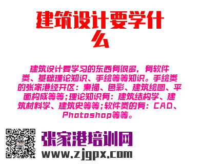 建筑设计要学习的东西有很多,有软件类、基础理论知识、手绘等等知识。手绘类的张家港经开区:素描、色彩、建筑绘图、平面构成等等;理论知识有:建筑结构学、建筑材料学、建筑史等等;软件类的有:CAD、Photoshop等等。