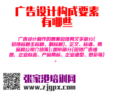 广告设计制作的要素包括有文字部分(包括标题主标题、副标题)、正文、标语、商品和公司介绍等);图形部分(包括广告插图,企业标志、产品商标、企业造型、色彩等)。