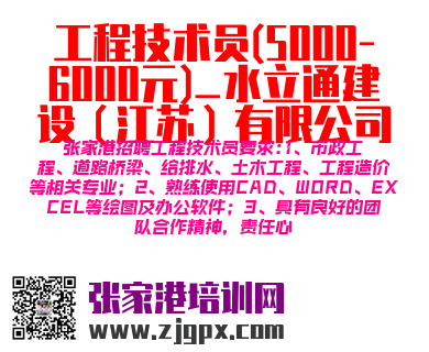张家港招聘工程技术员要求:1、市政工程、道路桥梁、给排水、土木工程、工程造价等相关专业;2、熟练使用CAD、WORD、EXCEL等绘图及办公软件;3、具有良好的团队合作精神,责任心