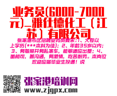 张家港市区招聘业务员要求:1、大专以上学历(***本科为佳);2、年龄35岁以内;3、有驾照并有私家车,能够适应出差;4、面相可,善沟通,有激情,吃苦耐劳。本岗位欢迎应届毕业生投递!说