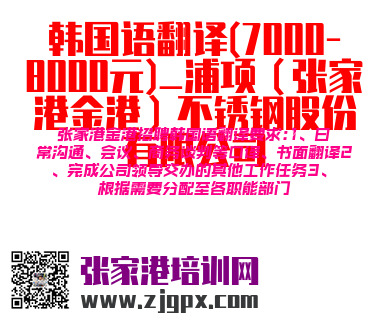 张家港金港招聘韩国语翻译要求:1、日常沟通、会议、商务谈判等口译、书面翻译2、完成公司领导交办的其他工作任务3、根据需要分配至各职能部门